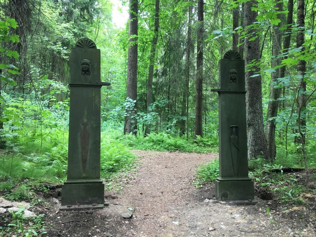 Объемно-пространственное и планировочное решение территории:историческое местоположение ворот в центральной части парка, на территории района Павловского парка «Новая Сильвия», на дорожке, ведущей к «Мавзолею «Супругу-благодетелю»; визуальные связи с элементами ансамбля.Объемно-пространственное решение: садовые чугунные ворота состоящие из пилонов и ворот в центре; габариты и конфигурация ворот.Архитектурно-художественное решение и конструктивная система: архитектурно-художественное решение в формах классицизма;плоские пилоны на цоколе с профилировками, с накладным декором в виде масок в верхней части и траурных урн - в нижней, профилированными стяжками, антефиксами в навершии; исторические рисунок и материал (чугун) пилонов, техника исполнения (литье); решетки ворот с накладным декором в виде перевернутых факелов и листьев аканта в верхней части; исторические рисунок и материал (чугун) ворот, техника исполнения (литье, ковка).