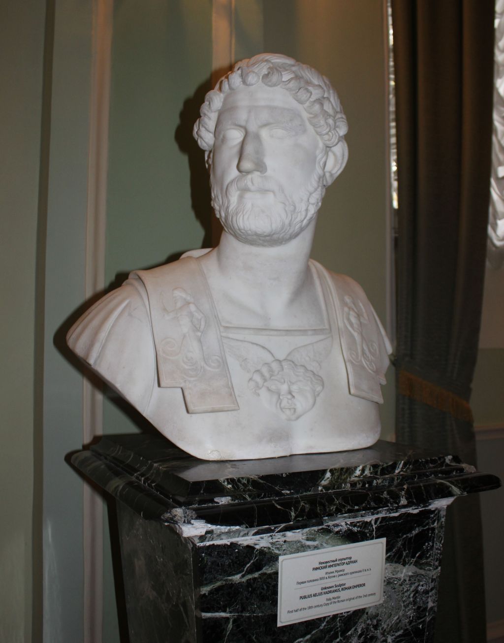 «Бюст императора Адриана», 1-я половина XVIII в. (копия с античного оригинала II в. до н.э.), XIX в. (постамент), куртина у восточного фасада Китайского дворца Мрамор. Погрудный бюст императора. На нем панцирь, украшенный медальоном с головой Горгоны. Плащ скреплен на правом плече крупной фибулой и падает красивыми складками. Лицо обрамлено холеной бородой с усами, вьющиеся волосы тщательно уложены на голове.