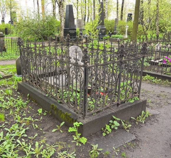 Объемно-пространственное и архитектурно-художественное решение:историческое местоположение захоронения, габариты и конфигурация надгробия (№ 2 на схеме); захоронения в границах участка;историческое архитектурно-художественное решение надгробия в виде трапециевидной мраморной прямоугольной в плане стелы с полуциркульным завершением, на прямоугольном в плане постаменте из белого мрамора, фланкированного беломраморными вазонами (разрушено), надгробие расположено на основании из красного гранита внутри земляной площадки подиума, ограниченного блоками известняка с металлической решёткой (на лицевой поверхности стелы вырублены и тонированы под золото контррельефные изображения пятиконечной звезды и шрифтовых литер); рисунок металлической ограды - вертикальные прутья квадратного сечения с пиками-лилиями, декорироваными волютами, хомутами, стойки с навершиями в виде четырёхгранных шишек; рельефные символы, содержание и характерные особенности надгробной надписи.