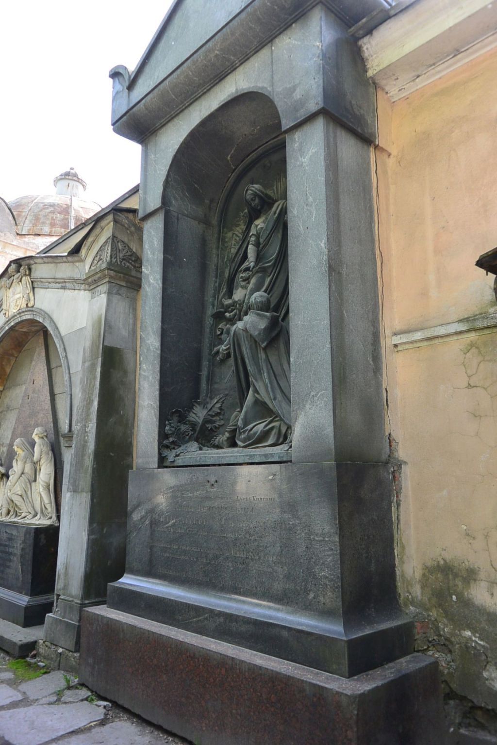 Объемно-пространственное и архитектурно-художественное решение: местоположение захоронения, габариты и конфигурация надгробия; авторское художественное решение надгробия в виде архитектурного портала черного гранита с фронтоном и акротериями, декорированными головками ангелов, с бронзовым горельефом в нише «Богоматерь в сиянии»; характер и содержание надгробной надписи.