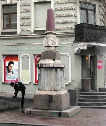 Объемно-пространственное решение:историческое местоположение, конфигурация, габариты; четырехгранный обелиск на трехступенчатом стилобате (гранит рапакиви) на цоколе; цоколь, состоящий из центрального куба (рускеальский мрамор) на плинте (тивдийский мрамор) и карнизной части (тивдийский мрамор);над карнизной частью - обелиск в виде заточенного сверху конуса (гранит рапакиви) на круглом основании (тивдийский мрамор) на кубе (рускеальский мрамор), установленном на круглом основании (тивдийский мрамор), укрепленном на цоколе кубической формы (гранит рапакиви);Конструктивная система и декоративно-художественное решение:материал столба (мрамор рускеальский, тивдийский; гранит раппакиви, гранит рапакиви; кирпич (основа)) цифры, выполненные в контррельефе, тонированные, обозначающие версты «21/3».