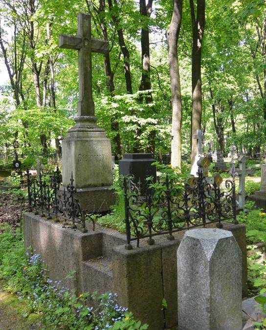Объемно-пространственное и архитектурно-художественное решение:историческое местоположение захоронения, габариты и конфигурация надгробия (семейное захоронение);историческое надгробие в виде каменного креста на прямоугольном в плане ступенчатом профилированном каменном пьедестале и прямоугольном в плане основании из красного гранита, внутри высокого подиума с цветником и ступенями, ограниченного гранитными блоками и металлической кованой оградой (рисунок ограды – вертикальные прутья и стойки, декорированные волютами, пиками-лилиями, хомутами); характер и содержание надгробных надписей.