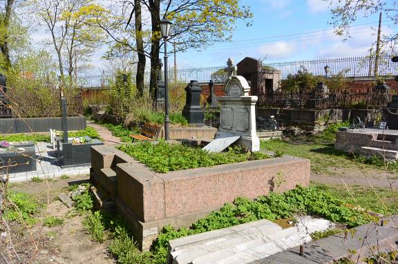 Могила Батюшкова Ф.Д. (1857-1920), литературоведа, 3-й-участок1.Объемно-пространственное и архитектурно-художественное решение:историческое местоположение, габариты и конфигурация участка (семейное место); захоронения в границах участка; надгробие в виде стилизованного алтаря из мрамора, на гранитном поребрике;характер и содержание надгробной надписи.