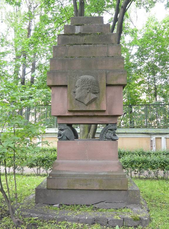 Объемно-пространственное и архитектурно-художественное решение:историческое местоположение захоронения и конфигурация надгробия; авторское художественное решение надгробия в виде квадратной в плане шестиступенчатой пирамиды из розового песчанника на четырёх угловых бронзовых опорах-маскаронах и ступенчатом профилированном постаменте того-же материала, на северной стороне пирамиды расположен квадратный каменный блок, на котором высечен портретный рельеф; рельефные символы, характер и содержание надгробных надписей.