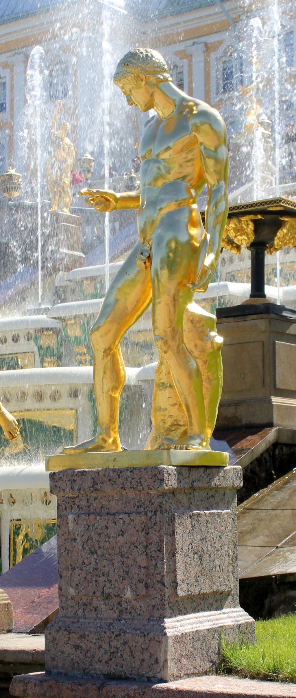 статуя «Дискобол» (бронза, литье, чеканка, золочение): мужская обнаженная фигура выполнена в полный рост, голова повернута к правому плечу и наклонена вниз, торс повернут влево, правая рука согнута в локте и протянута вперед, в левой руке, опущенной вниз, держит диск, прислонив его к левому бедру, правая нога, согнутая в колене, выставлена вперед и вправо, опирается на левую ногу, согнутую в колене и отставленную назад, основание прямоугольное с закругленными боковыми сторонами;пьедестал (гранит, рубка, шлифовка): четырехгранный, с профилированным основанием и карнизом, с квадратными профилированными филенками по сторонам.