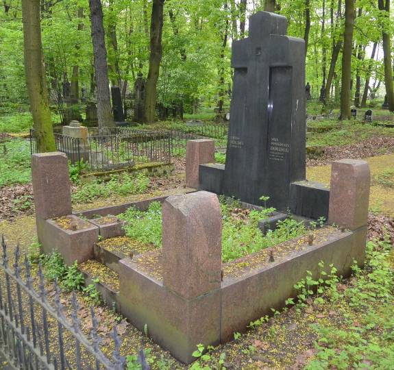 Объемно-пространственное и архитектурно-художественное решение:историческое местоположение захоронения, габариты и конфигурация надгробия (семейное захоронение); историческое художественное решение надгробия в виде подиума (красный гранит) со стелой-стенкой (чёрный полированный гранит), декорированной рельефным изображением четырёхконечного креста, на прямоугольном в плане подиуме, ограниченном блоками из красного гранита, со ступенями и металлической оградой (утрачена), углы подиума акцентированы по тумбами-параллелепипедами; рельефные символы, характер и содержание надгробных надписей