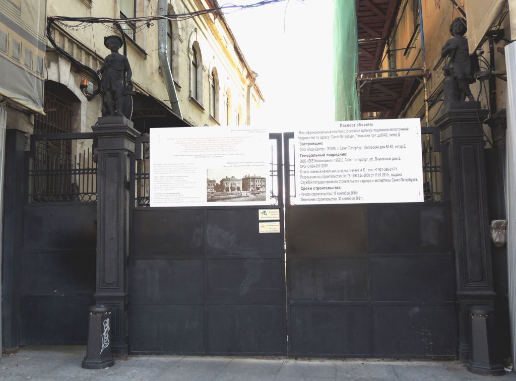Архитектурно-художественноерешение: местоположение (со стороныЛиговского проспекта — ворота сдвумя калитками между зданиемОсобняка и зданием Заводоуправления(лит. Б); опорные столбы ворот (четыре штуки):фигурные с фигурными контрфорсамив нижней части, увенчанные шишкамипиний; материал (чугун); местоположение (со стороныЛиговского проспекта — ворота содной калиткой между зданиемЗаводоуправления (лит. Б) и зданиемПроходной (лит. Д); опорные столбы ворот (два),квадратные в плане, декорированныепрофилированными филенками икарнизом (материал – чугун),увенчанные фигурками мальчиков,изображающих Гефеста и Гермеса(чугун, литье). Гефест изображен вкузнечном фартуке, держит в правойруке молот, опирающийся нанаковальню. Гермес в шапочке скрыльями держит факел в правой руке,под его левой рукой с зажатымкошельком – бочка.