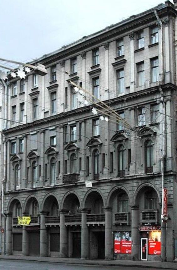 Объемно-пространственное решение:габариты и конфигурация в плане (замкнутое каре) 6-7-этажного здания, включая воротный проезд с плоским конфигурация (скатная) и габариты крыши, включая местоположение, габариты, конфигурацию, материал мансардного этажа, слуховых окон и дымовых труб.Конструктивная система здания:фундамент ленточный бутовый (местоположение, габариты, конфигурация, материал);наружные и внутренние капитальные стены (местоположение, вид материала – кирпич), лестницы и лестничные клетки;воротный проезд – местоположение, габариты, конфигурация (прямоугольная);междуэтажные перекрытия (для помещений с архитектурно-художественной отделкой);отметки междуэтажных перекрытий (для помещений без архитектурно-художественной отделки);парадная лестница – местоположение (со стороны ул. Куйбышева), на металлических косоурах; тип – двухмаршевая; ступени лещадной плиты с валиком; материал (дерево) и профиль поручня, ограждение в виде прямых металлических стоек;лестницы дворовых корпусов:лестничные марши на косоурах, тип – двухмаршевые; ступени лещадной плиты с валиком; материал (дерево) и профиль поручней, ограждение в виде прямых металлических стоек;Архитектурно-художественное решениефасадов:архитектурно-декоративная композиция в стилистике неоклассицизма;лицевой фасад:материал и характер фасадной поверхности: терразитовая штукатурка, имитирующая гранит, рустовка под квадры камня;оконные и дверные проемы –местоположение, габариты, конфигурация (прямоугольный дверной проем;оконные проемы:- прямоугольные витринного типа в уровне 1 этажа с возможностью устройства в них дверных проемов;- полуциркульные широкие в уровне 2-го этажа по трем центральным осям фасада;- прямоугольные с лучковой перемычкой в уровне 2 этажа;- прямоугольные с полуциркульной перемычкой в уровне 3 этажа (с двумя вертикальными прямоугольными проемами по сторонам, кроме крайних оконных проемов);- прямоугольные в уровне 4-6 этажей (с двумя вертикальными прямоугольными проемами по сторонам по центральной световой оси в уровне 4 и 5 этажей);входные двери со стороны улицы – деревянные, филенчатые, двусветлые, три верхние филенки остекленные, нижняя - профилированная*;* утрачены;историческая расстекловка оконных проёмов – материал (дерево), рисунок, цвет (коричневый);аркада на трехчетвертных колоннах стилизованного тосканского ордера;штукатурные профилированные архивольты, оформляющие арки;три лоджии по центральной оси фасада, расположенные в аркаде, с полуциркульными проемами в них, с ограждением в виде балясин;пилястры с элементами стилизованного ионического ордера, объединяющие третий – четвертый, и коринфского – пятый и шестой этажи;междуэтажные карнизы третьего и пятого этажей;венчающий профилированный карниз стилизованных кронштейнах с поясом иоников;французские балконы второго этажа, расположенные с двух сторон в двух крайних осях – местоположение, габариты, конфигурация; ограждение балконов в виде балясин;французские балконы 3-го и 5-го этажей – местоположение, габариты, конфигурация; ограждение балконов в виде балясин; утрачены;французский балкон по центральной оси третьего этажа, с ограждением по паре балясин по сторонам и центральным глухим с горельефным изображением мифологической сцены;оформление оконных проемов – лучковы