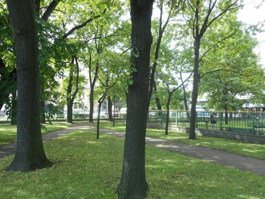 Сад, 1765 г., арх. Волков С.А., 1841 г., садовый мастер Кузнецов, арх. Реймерс И.И., 1889 г. (обозначен на плане цифрой 4):Планировочное решение – регулярное, с симметричной композицией;Планировка закреплена аллейными т рядовыми посадками деревьев: аллеи с западной и восточной сторон, рядовая посадка с южной стороны;Старовозрастные насаждения (преимущественно дубы, липы, клены, ясень) в рядовой и аллейной посадках;Мемориальное дерево – дуб черешчатый в северо-восточном углу в границах территории собственного сада (за внутренней оградой);Историческое местоположение утраченных мемориальных деревьев в границах внутренней ограды сада (пни);Газоны – тип (обыкновенные);Садово-парковые дорожки – тип (набивные из высевок розового гранита, на щебеночном основании);Центральная осевая дорожка сада в границах внутренней ограды с площадкой под бюст Петра I;Два исторических фонаря, фланкирующие ворота внутренней ограды (по сторонам от центральной осевой дорожки)*: чугунного литья, на высоком шестигранном основании, с примыкающим к основанию кронштейном на прямоугольной базе, каннелированный столб круглого сечения декорирован акантовыми листьями по всей длине, остекленный фонарь шестигранный, увенчан композицией из волютообразных завитков и пальметт* первоначально до 1880-х гг. фланкировали вход с северной стороны