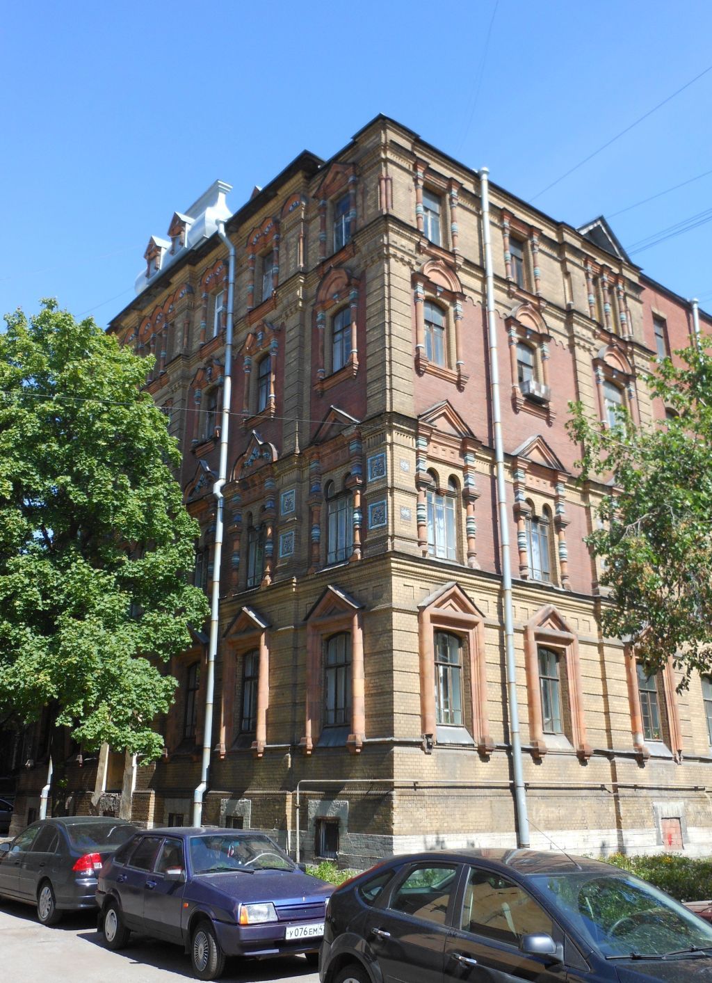 1Объемно-пространственное решение:четырехэтажное здание, прямоугольное в плане, на полуподвале, с угловым ризалитом на восточном фасаде, раскреповками, завершенное крышами сложной конфигурации, с аттиковыми кубоватыми объемами; исторические габариты и конфигурация здания в плане; дымовые трубы – исторические местоположение, конфигурация, материалы (кирпич); крыша со слуховыми окнами – исторические габариты, сложная конфигурация с аттиком кубоватой формы на западном фасаде; высотные отметки; исторический материал окрытия.2Конструктивная система здания: наружные и внутренние кирпичные капитальные стены здания; исторические отметки перекрытий; своды с распалубками, своды по балкам (надподвальные, в помещениях бывшей домой церкви, в помещении лестниц); две лестницы с известняковыми ступенями и металлическим ограждением, в том числе их конструкции, габариты, местоположение, материал ступеней (известняк), рисунок ограждений;3Объемно-планировочное решение:объемно-планировочное решение в габаритах капитальных стен.4Архитектурно-художественное решение фасадов:архитектурно-художественное решение фасадов в приемах псевдорусского стиля (западный фасад, западная часть северного и южного фасада) и рационального модерна (восточный фасад, восточная часть северного и южного фасада);материал и характер фасадной поверхности – облицовочный кирпич, майоликовые изразцы, штукатурные детали;цоколь, облицованный известняком; выложенные известняком порталы цокольных окон;оконные и дверные проемы - исторические габариты, конфигурация (прямоугольные, с лучковыми, полуциркульными, трехцентровыми завершениями, в том числе сдвоенные, окна-люкарны), местоположение;историческое оформление оконных и дверных проемов:- профилированный архивольт в оформлении дверного проема северного фасада;- веерная кладка в оформлении проемов (восточного фасада, части северного и южного фасадов);- профилированные наличники с валиком по краю, с треугольными сандриками, окрытыми металлом (окна первого этажа);- гирьки, колонки с «дыньками», перехватами, стилизованные замковые камни, фигурные и треугольные сандрики (в том числе разорванные, килевидные; вставки майоликовых изразцов);исторический рисунок, материал (дерево), цвет оконных и дверных заполнений;- оформление тройного окна с полуциркульными завершениями на западном фасаде – колонки с перехватами, гирьки, тройной архивольт над проемом, «трехцентровой» архивольт с поясом зубчиков со стилизованным трехлопастным кокошником на стилизованных колонках с дыньками в тимпане, майоликовые вставки с растительным орнаментом;- стилизованный портал в оформлении окна первого этажа раскреповки западного фасада, два щелевидных окна с полуциркульным завершением по сторонам от портала; раскреповки по фасадам, угловой ризалит на восточном фасаде; декоративное оформление фасадов: - имитация арок с полуциркульным завершением (на высоту 2-3-го этажей) в кирпичной кладке по восточному фасаду и, частично, по северному и южному фасадам;- гладкие лопатки по восточному фасаду и, частично, по северному и южному фасадам;- карнизы и тяги (надцокольная, междуэтажные), в том числе с широкими фризами с поясами поребрика, зубчиками, стилизованными аркатурными поясами, профилированными нишками; - лопатки с рустом, вставками по
