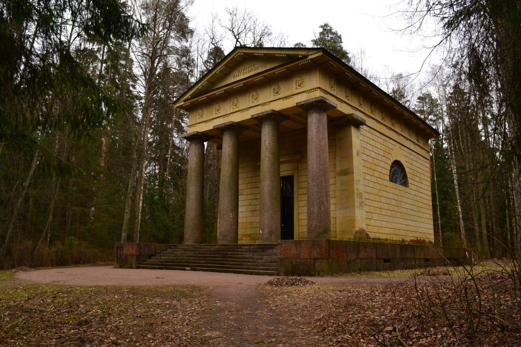 Объемно- пространственное и планировочное решение территории: местоположение павильона в центральной части парка, на территории «Новой Сильвии», торцевым северным фасадом обращенного к реке Славянке; визуальные связи с элементами комплекса, в том числе с «Воротами Ново-Сильвийскими», «Каскадом Руинным».Объемно-пространственноерешение:павильон одноэтажный, прямоугольный в плане, в форме простиля, на высоком стилобате, с подвалом, завершенный двухскатной крышей;местоположение, габариты и конфигурация павильона;крыша – габариты, конфигурация (двухскатная), материал окрытия (металл), высотные отметки. Конструктивная система здания:кирпичные капитальные стены;цилиндрический кессонированный свод;четыре гранитные колонны дорического ордера;гранитная лестница с глухими парапетами.Объемно-планировочноерешение:объемно-планировочное решение в габаритах капитальных стен.Архитектурно-художественное решение:архитектурно-художественное решение в формах классицизма; материал и характер фасадной поверхности – известняк с разделкой под руст, в том числе с веерной разделкой над оконными проемами;гранитный стилобат с лестницей и узкими оконными проемами по продольным сторонам; оконные проемы – габариты, конфигурация (полуциркульные) и местоположение;оконные заполнения – рисунок расстекловки, материал, цвет (белый);четырехколонный портик со стилизованными дорическими колоннами, с капителями с поясом иоников;угловые пилястры с гранитными капителями с поясами иоников;дверной проем – габариты, конфигурация (прямоугольный) и местоположение;заполнение дверного проема – металлическая ажурная решетка геометрического рисунка, в том числе с поясами меандра;оформление дверного проема – профилированный наличник, прямой профилированный сандрик;треугольные фронтоны с надписями «Супругу-Благодетелю» (с северо-западной стороны) и «Павлу I Императору и Самодержцу Всероссийскому. Родившемуся сентября 20-го дня 1754 года. Скончавшемуся марта 11-го дня 1801 года» (с юго-восточной стороны); оформление потолка портика – кессоны с орнаментальными поясами с круглыми лепными розетками с листьями аканта и шишками пинии (гипс, лепка);полный антаблемент с гладким архитравом, гуттами, триглифно-метопным фризом, женскими маскаронами в метопах;Декоративно-художественная отделка интерьеров:облицовка стен – искусственный белый мрамор в верхней части стены,