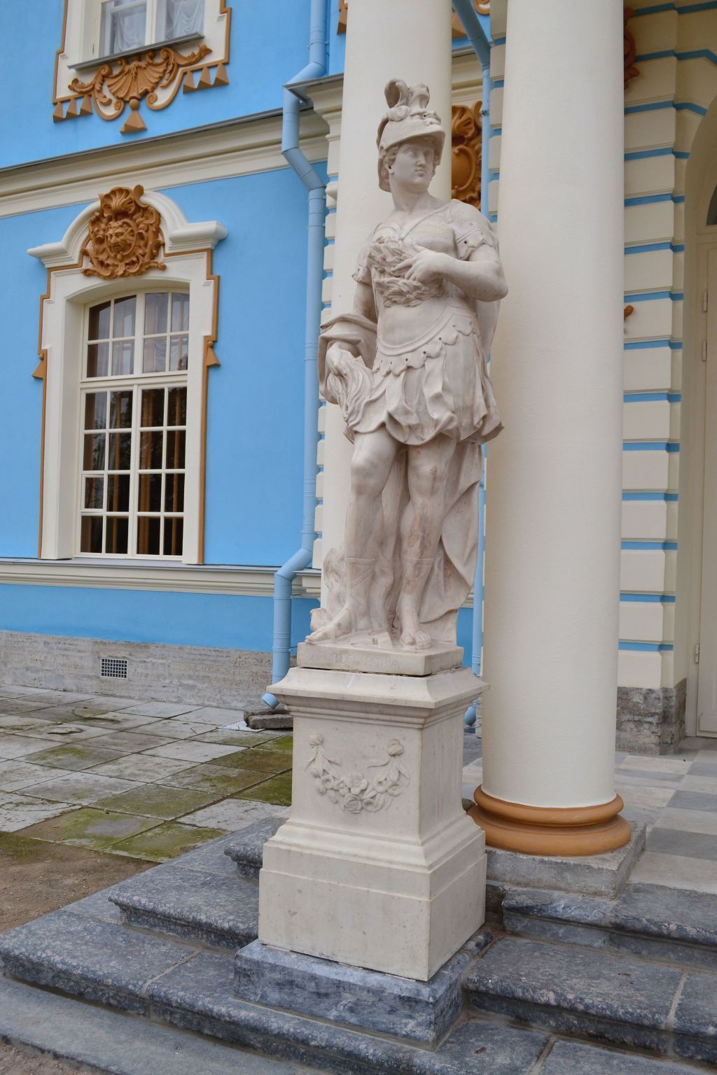 Объемно-пространственное и пластическое решение;Круглая скульптура, изображающая стоящую мужскую фигуру в облачении римского легионера, держащего в руках дубовую ветвь; надписи на основании: «AMOR DE LA PATRIA» – спереди, «BORTOLO MODOLO» - сзади;начало XVIII в., скульпторы Б. Модоло, белый мрамор.