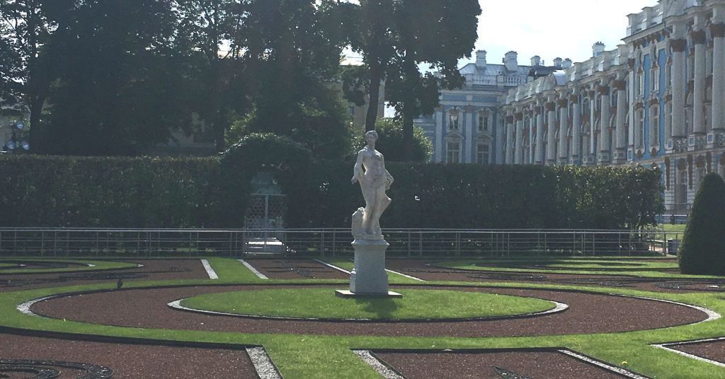 Объемно-пространственное и пластическое решение;круглая аллегорическая скульптура, в виде женской фигуры с драпировками на бедрах и львом у ног; нач. XVIII в., скульптор Цеминиани Ф., белый мрамор.