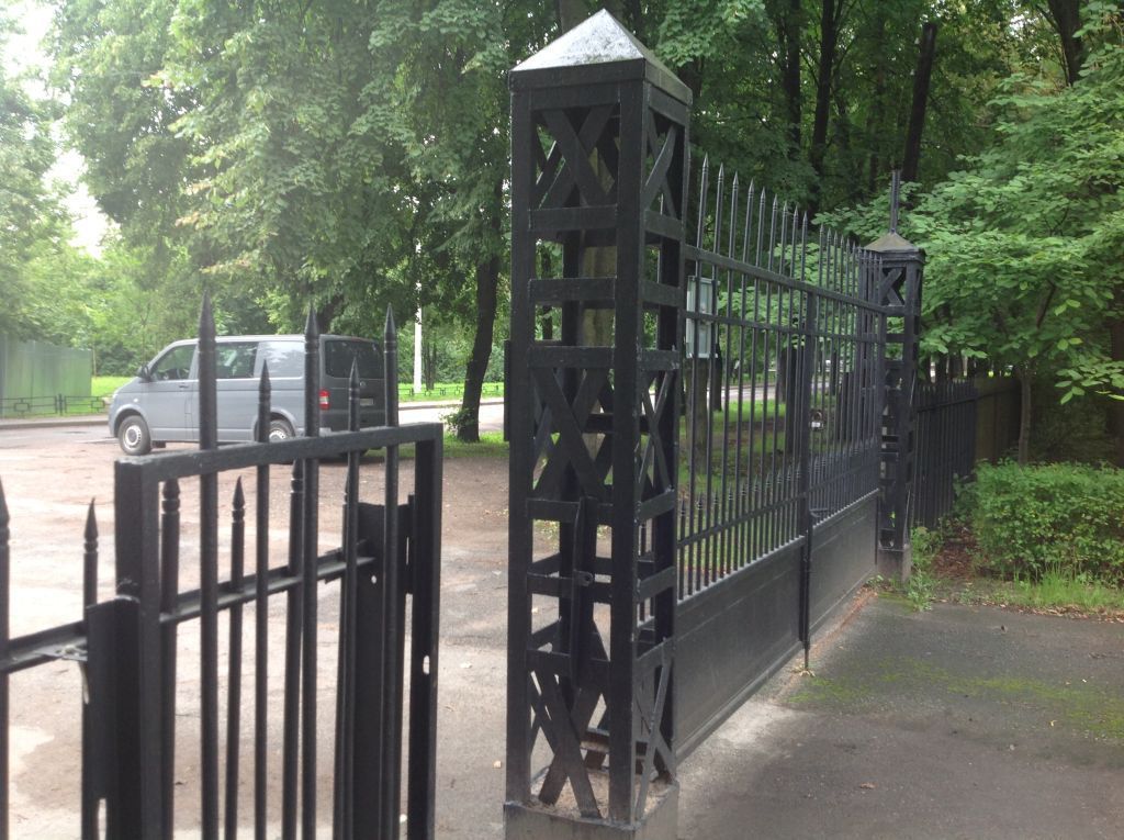 XIII. Ограда(Политехническая ул., между Фаворского ул. и створом Курчатова ул.)историческая ограда с воротами по юго-западной границе парка (вдоль улицы Фаворского и вдоль ул. Политехнической) - высота, рисунок, материал (металл), техника исполнения (ковка), исторический цвет решетки, угловых конструкций, ворот; цоколь кирпичный под штукатуркой;