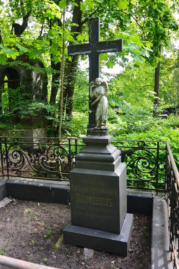 Объемно-пространственное и архитектурно-художественное решение:историческое местоположение захоронения, габариты и конфигурация надгробия (семейное захоронение); историческое надгробие в виде четырёхконечного креста с базой, со скульптурным изображением ангела в основании креста, на прямоугольном в плане профилированном пьедестале и основании из серого гранита, на прямоугольном в плане подиуме, ограниченном гранитным поребриком с металлической кованой оградой, звенья которой декорированы волютами, кольцами и стилизованными листьями аканта;характер и содержание надгробных надписей.