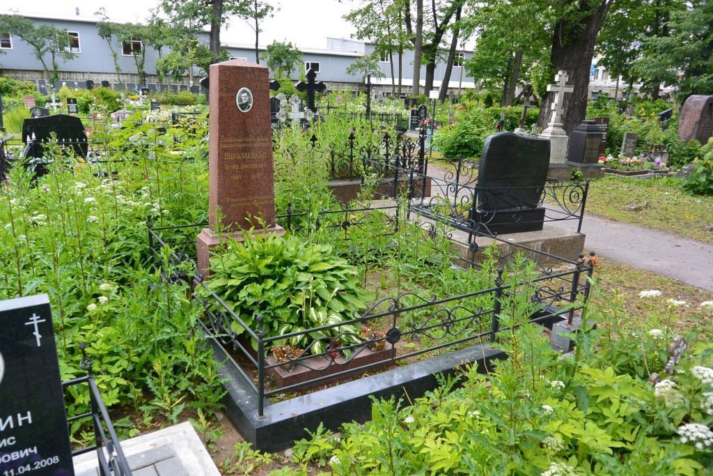 1.Объемно-пространственное и планировочное решение территории: историческое местоположение, габариты и конфигурация (№ 8 на схеме); захоронения в границах участка.2.Объемно-пространственное и архитектурно-художественное решение:исторические местоположение, габариты и конфигурация надгробия; художественное решение надгробия (стела из розового гранита на ступенчатом пьедестале с цветником, внутри поребрика с оградой); вид материала ограды – металл; портретное изображение на эмали овальной формы, характер и содержание надгробной надписи.