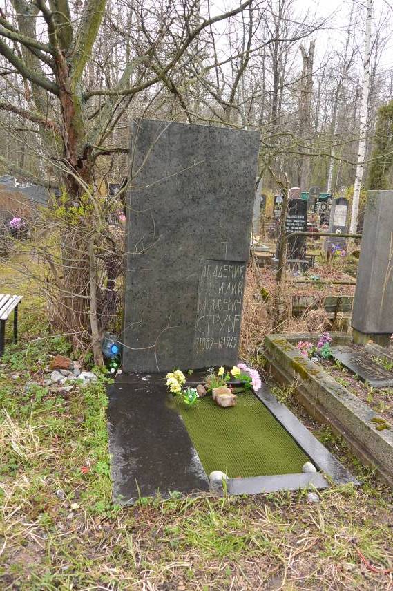 Объемно-пространственное и планировочное решение территории: историческое местоположение в центральной части Серафимовского кладбища в западной части Коммунистической площадки, конфигурация участка (№ 15 на схеме); захоронения в границах участка. Объемно-пространственное и архитектурно-художественное решениегабариты, конфигурация и объёмно-пространственное решение надгробия в виде прямоугольной в плане, вертикально поставленной прямоугольной стелы из полированного тёмно-серого гранита (надгробие расположено на прямоугольной площадке мощёной плитами полированного тёмно-серого гранита, на лицевой поверхности стелы в нижней правой скошеной части стелы вырублены и тонированы контррельефные шрифтовые литеры надгробной надписи, выше вырублено контррельефное изображение четырёхконечного креста); рельефные символы, характер и содержание надгробных надписей.