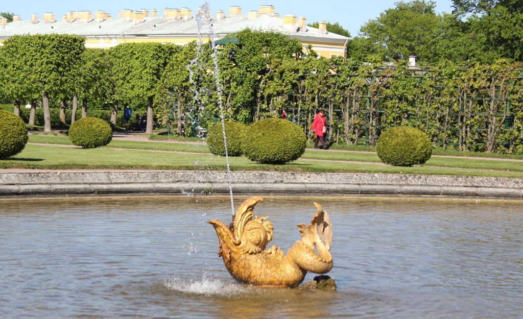 VIII. 3. «Фонтанные фигуры «Дельфин» (четыре)», 1737 г., ск. Растрелли Б.-К., 1957 г. (воссоздание), ск. Гуржий А.Ф.Архитектурно-художественное решение:фонтанные фигуры, изображающие дельфинов (бронза, позолота).