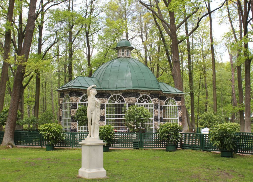 «Вольеры (два)», Санкт-Петербург, город Петергоф, Нижний парк, у восточного и западного берегов Менажерийного прудаОбъемно-пространственное решение:исторические габариты, местоположение и конфигурация крестообразных в плане вытянутых двенадцатиграников;вольеры имеют одинаковое оформление, расположены симметрично с западной и восточной сторон Менажерийного пруда по одной оси с фонтаном «Солнце»;исторические высотные отметки, местоположение, конфигурация (в центральной части объемов павильонов –купольная с латернами (у латерны – полусферическое завершение); у боковых объемов павильона – трехскатная), габариты, исторический материал окрытия крыш (металл), цвет.Конструктивная система:исторические деревянные стены и купольные перекрытия павильонов, завершённые деревянными фонариками.Объемно-планировочное решение:историческое объемно-планировочное решение (трехчастное помещение).Архитектурно-художественное решение фасадов и предметы декоративно-прикладного искусства:архитектурно-художественное решение вольеров, выполненные в характере деревянных садово-парковых павильонов первой четверти XVIII в.:отмостка вокруг павильонов – булыжный камень;материал и характер отделки фасадов и цоколя:цоколь – облицован туфом, по верхнему краю декорирован деревянной доской;фасады – деревянные стены павильонов, окрашены зеленой краской и облицованы туфом в виде рустов, чередующихся с полосами черной «изгари» и перламутровых раковин*;* раковины в 1881 году заменены на керамические кружки;исторические оконные и дверные проемы, – местоположение, конфигурация (прямоугольные с полуциркульным завершением), габариты, включая оконные проемы световых фонарей (прямоугольные); заполнение оконных и дверных проемов – материал (дерево), исторический рисунок расстекловки (полуциркульные фрамуги – радиальная расстекловка; оконные проемы – мелкая квадратная расстекловка), цвет (белый);венчающий карниз с выступом облицован мелким и крупным туфом в виде рядов руста;латерны – облицованы туфом, в завершении деревянная резная ваза.Декоративно-художественная отделка интерьеров, предметы декоративно-прикладного искусства:интерьеры вольеров оформлены орнаментально-фигурной, полихромной, живописью с бликовкой золотом, XVIII в. (масло по дереву): Западный вольер:оформление восьмигранного купола – орнаментально-декоративная живопись (худ. Л. Каравакк, темпера по дереву, бликовка золотом, XVIIIв., реставрационные работы 2004г.), купол разделен филенками на восемь граней, в центральной части расположен световой фонарь*; калевки филенок позолочены, профилированы; зеркало филенок расписано на сюжеты из мифов о Диане и Актеоне, Аполлоне и Авроре, изображены фигуры играющих амуров; пышные гирлянды цветов, листьев и арабесковые орнаменты; *роспись в световом фонаре утрачена;оформление стен – орнаментальная роспись на светло-сером фоне из картушей, с ветвями лиственного рисунка, цветущего аканта, раковинами (темпера по дереву); в завершении фриз с профилированным карнизом и выступом, метопами (расписаны под листья аканта и розеттой) и триглифами (позолочены); периметральная тяга с росписью под камень (розовый мрамор?);оформление оконных и дверных проемов – деревянные профилированные наличники, цвет – светло-зеленый;покрытие пола – в центральной част
