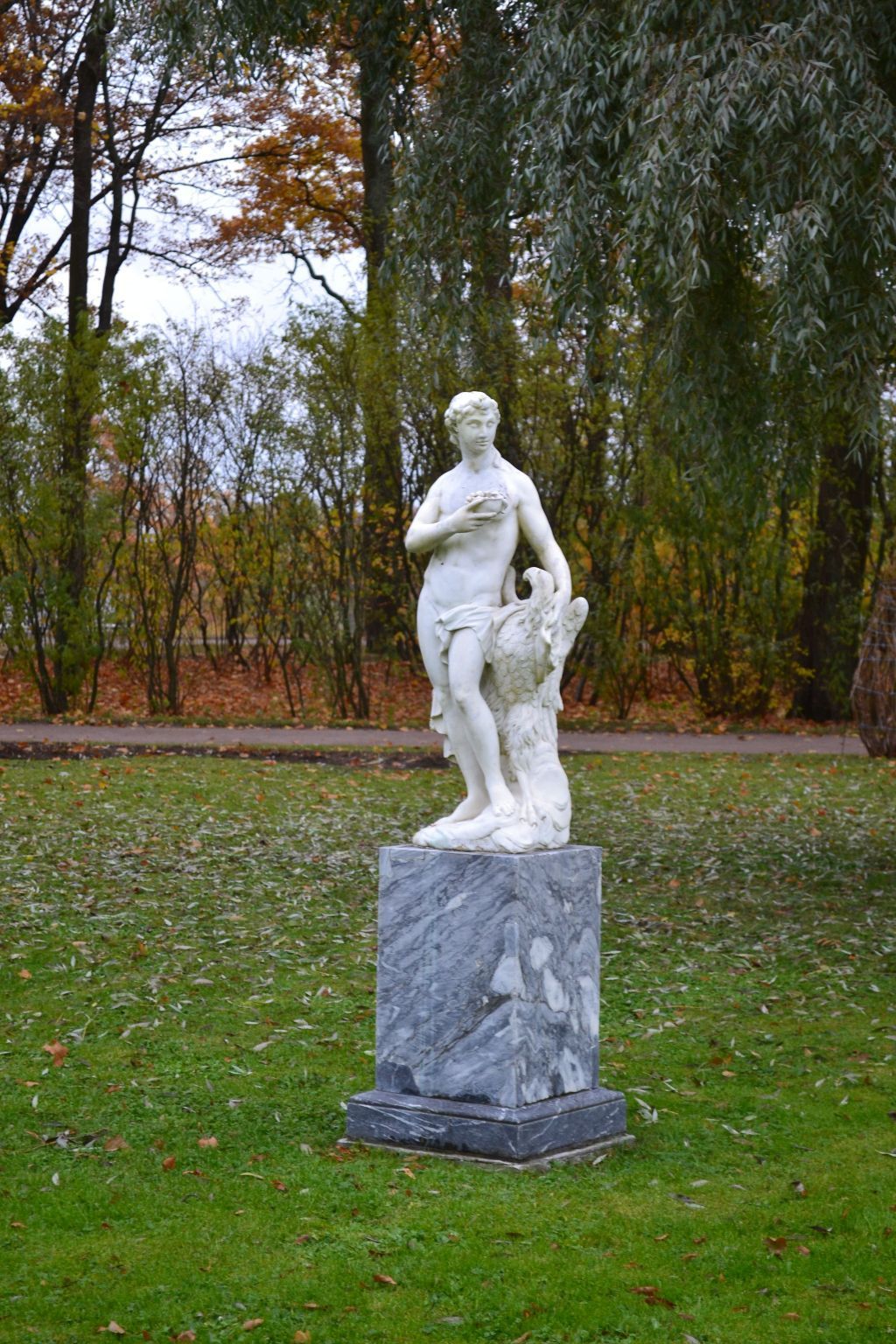 круглая скульптура Ганимеда в виде стоящей обнаженной мужской фигуры с кубком в руке и орлом у ног;нач. XVIII в., XIX в., белый мрамор.