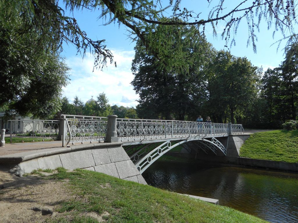 Объемно-пространственное иконструктивноерешение: «большой» мост через протокуБольшого пруда, соединяетБольшой остров с восточнойчастью парка: расчетный пролетарки - 13,15 м, однопролетный;местоположение, конфигурацияв плане, габариты;металлическое пролетноестроение состоит из пятиглавных арок, опирающихся намассивные устои, облицованныегранитом; п ролетноестроение состоит из пятиодинаковых плоских арочныхферм;в состав фермы входят двеарки (верхняя и нижняя),соединенные кольцевымиэлементами, и прогон,опирающийся на арки имассивные устои в гранитнойоблицовке;сечение всех арочных ферм -сплошные, выполнены изкованого железа;все соединения выполнены припомощи металлических штырей;пешеходный настил - чугунныеплиты; «малый» мост через протокуБольшого пруда, соединяетБольшой остров с юго-западнойчастью парка: расчетный пролет10,6 м., ширина - около трехметров, однопролетный;пролетное строение состоит изчетырех железных арок,опирающихся на них четырехпродольных балок-прогонов, сопиранием на массивные устоив гранитной облицовке;пешеходный настил - чугунныеплиты. Архитектурно-художественноерешение: мост через протоку Большогопруда, соединяет Большой островс восточной частью парка:- кованое металлическоеограждение геометрическогорисунка в в идеперекрещивающихся овалов иокружностей с круглымирозетками на средокрестиях;- в пролете поддерживаютсятонкими наружнымивертикальными кронштейнами,прикрепленными к крайнимпрогонам;- крепление на штырях;- четыре круглых в сечениитумбы из серого с белымипрожилками мрамора;- форма устоев с карнизами; мост через протоку Большогопруда, соединяет Большой островс юго-западной частью парка:- кованое металлическоеограждение в виде круглых всечении прутьевдекорированныхстилизованными кистями, вверхней части, завершенныешарами;- четыре круглых в сечении тумбы из серого с белымипрожилками мрамора;- форма устоев с карнизами.