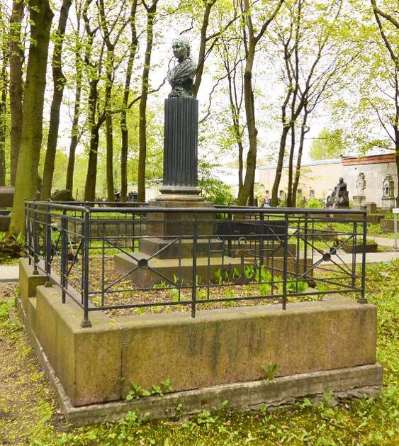 Объемно-пространственное и архитектурно-художественное решение:историческое местоположение захоронения, габариты и конфигурация надгробия (семейное захоронение); историческое авторское художественное решение надгробия в виде портретного бронзового бюста на высоком пьедестале из чёрного полированного гранита в виде канелированной полуколонны с базой на квадратном в плане постаменте красного гранита, надгробие расположено в центре подиума, ограниченного поребриком из блоков красного гранита со ступенями и металлической оградой (рисунок ограды – вертикальные и горизонтальные прутья, стойки, звенья ограды в виде диагональных перекрестий с розетками, с северной стороны к ограде прикреплён плоский металлический якорь); рельефные символы, характер и содержание надгробных надписей.