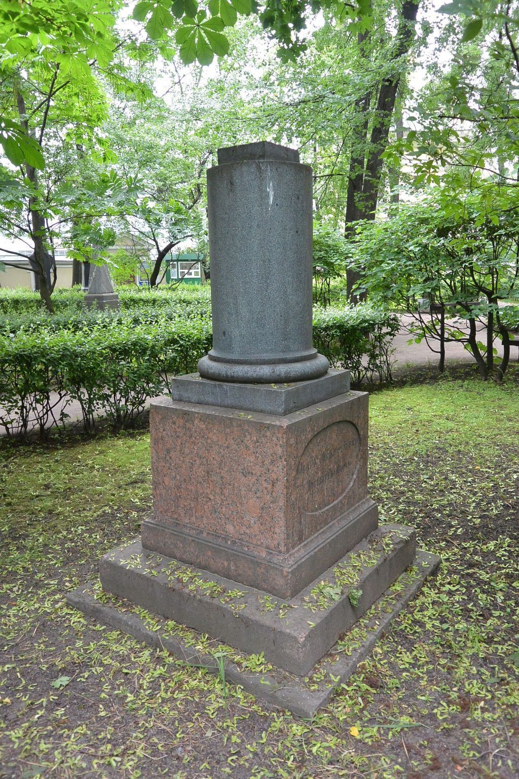 Объемно-пространственное и архитектурно-художественное решение:историческое местоположение захоронения и конфигурация надгробия; историческое решение надгробия в виде полуколонны из серого гранита на квадратном в плане пьедестале из красного гранита и ступенчатом основании (навершие в виде траурной урны, декорипованной гирляндами, утрачено), на лицевой поверхности пьедестала в овальном углублении вырублены буквенные литеры; характер и содержание надгробных надписей.