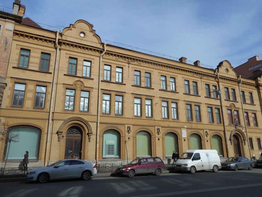 Объемно-пространственное решение:габариты и конфигурацияпрямоугольного в плане трех-четырех этажного здания, частично на подвалах, с двумя прямоугольными в плане внутренними дворами;два* прямоугольных в планеворотных проезда северо-восточного дворового корпуса;(*воротный проезд лицевого флигеля был заложен в 1990-е гг.);форма, габариты и конфигурация крыш;высотные отметки коньков крыш.Конструктивная система:наружные и внутренние капитальные стены (кирпичные);своды перекрытий, в том числе:коробовые своды на пилонах, перекрывающие подвальные помещения;коробовый свод на с распалубками, перекрывающий помещение парадного вестибюля;цилиндрические своды на подпружньгх арках с распалубками, перекрывающие воротные проезды северо-восточного дворового флигеля;прусские своды в основании площадок служебных лестниц;исторические лестницы: лестничные клетки и вестибюли, их объемно-планировочное решение, в том числе:парадная лестница Л-1:вход в вестиоюль организован со стороны Звенигородской улицы -двухмаршевая, марши на косоурах, ступени из лещадной плиты;металлическое кованое ограждение выполнено в виде ажурной решетки, декорированной цветами ириса, под деревянным профилированным поручнем;двасредистенных перехода, в восемь ступеней, между уровнями вестибюля парадной лестницы, ступени из лещадной плиты;служебная лестница, расположенная в центральной части лицевого корпуса: двухмаршевая, марши на косоурах, площадки на прусских сводах, ступени из лещадной плиты;металлическое кованое ограждение выполнено в виде ажурной решетки, декорированной розетками, под деревянным профилированнымпоручнем;служебная лестница, расположенная в западной части лицевого корпуса: двухмаршевая, марши на косоурах, площадки на прусских сводах, ступени из лещадной плиты.Объемно-планировочное решение:историческое объемно-планировочное решение в габаритах капитальных стен. в том числе габариты помещений с художественно-декоративной отделкой.Архитектурно-художественное решение фасадов:лицевой фасад, шириной в двадцать одну световую ось, обращен к Звенигородской улице, решен в приемах модерна;материал и характер отделки фасада: облицовочный кирпич, штукатурные детали, разделанные под руст; цоколь облицован плитамиизвестняка;прямоугольный в плане эркер на высоту второго-третьего этажей,имеет щипцовое завершение;рельефное панно между оконными проемами второго и третьегоэтажей, орнаментальная композиция в стилистике модерна;арка воротного проезда*, с трехцентровой пониженнойперемычкой, обрамленнаяпрофилированным наличником; (проезд заложен в 1990-е гг.);металлические кованыедвустворчатые ворота, выполненные в виде ажурной решеткой с цветами ириса, в стилистике модерна;дверные проемы;местоположение (по 3-4 и 15-16 световым осям), конфигурация (с полуциркульными перемычками),габариты;дверные проемы оформленыперспективными наличниками ипрофилированными архивольтами налепных рельефных кронштейнах смодульонами;по две ступени из серого гранита;заполнение дверных проемов:деревянные двустворчатыефиленчатые полусветлые двери с полуциркульными фрамугамивеерной расстекловки с толстыми стеклами с фаской;ручки латунные, 8-образные;оконные проемы:местоположение, конфигурация(прямоугольные, витринные окна стрехцентровыми пониженнымиперем