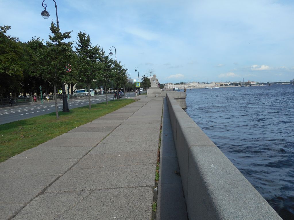 Объемно-планировочное и объемно-пространственноерешение: местоположение: р. Невы правый берег, от Петроградской наб. до Троицкого моста; объемно-пространственная и композиция (габариты и конфигурация) набережной, включающая два полукруглых в плане спуска и прямоугольный в плане спуск-пандус, пристань прямоугольную в плане с двумя маршами лестниц и скульптурными композициями по сторонам («Ши-цза»), глухое парапетное ограждение, в том числе каменные тротуары, травяные газоны, посадки деревьев;объемно-планировочное решение в габаритах подпорных стенок (над- и подводных) и проезжей части.конструктивная система: фундамент; стенки набережной и спусков; горизонтальная кчадка стенок из гранитных блоков; парапетные блоки и тумбы, каменные тротуары.архитектурно-художественное решение: набережная - парапетные блоки с профилировкой по внешнем}' верхнему углу блока, материал: розово-красный гранит.тротуарный настил -материал (розово-красный гранит), габариты, конфигурация настила и рисунок укладки настила (в два ряда массивных гранитных блоков); вертикальные отметки настила набережной и нижней площадки спусков; спуски -№ 3 (по плану границ территории ОКН) - полукруглой конфигурации, местоположение, габариты, в том числе лестниц со ступенями розово-красного гранита, блоков парапета (с профилировкой по внешней части);оформление внешних стенок блоков парапета фигурными филенками и профилировкой основания;металлические поручни на одной вертикальной фигурной стойке и горизонтальных консолях, вмонтированных в гранитный парапет (на восточном спуске -частично утрачены, сохранилисьвмонтированные в тротуарный настил основания вертикальных строек);металлические кольца наторцевых частях парапетныхблоков спуска;гранитная скамья на фигурныхкронштейнах;рымы двух типов (причальные кольца) - местоположение, габариты, конфигурация, материал (металл), техника (ковка);спуск-пандус - местоположение габариты, конфигурация в плане; скат пандуса, выложенный булыжником:пристань со львами «Ши-цза»(1903 г. (пристань), инж.Пшеницкий А.П.. 1907г., арх.Бенуа Л.Н.) -местоположение (напротив ОКНфедерального значения «ДомикПетра I»). габариты,конфигурация в плане:два марша гранитных лестниц сплощадками;материал - розово-красныйгранит:оформление -гранитные скульптуры китайских львов «Ши-цзы» - на трехчастных гранитных постаментах (верхний блок розово-красного гранита, два нижних -серого цвета) с надписью на среднем блоке: «Ши-цза из города Гирина в Маньчжурии перевезена в Санкт-Петербург в 1907 году. Дар генерала от инфантерии Н. И. Гродекова»;описание -скульптурные львы, высеченные из серого гранита, покоятся на трехчастном пьедестале с рельефным изображением: общая композиция пьедестала является стилизацией трехчастнойструктуры алтаря, в данном случае верхняя и нижняя части зеркальны друг другу и изображают стилизованныйлотос, средняя часть разделена на ячейки, в которыхконтррельефом обозначенынадписи китайскимииероглифами. Сами скульптуры львов монолитно высечены вместе с плинтом. на которых они восседают. Фигуры изображены с гипертрофированно большими пастями, с высунутым языком. Туловища трактованыутрированно.Фигура, расположенная справа (ближе к Троицкому мосту) левой лапой придерживает львенка. У левой фигуры, правая лапа покоится на шаре. Фигуры 