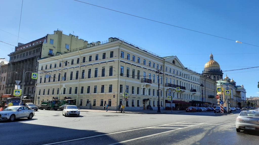 1Объемно-пространственноерешение:исторические конфигурация и местоположение двух лицевых (по Адмиралтейскому пр. и по Гороховой ул.) и трех дворовых корпусов, включая арочные проезды лицевого корпуса (по Гороховой ул.), арочный проезд поперечного дворового корпуса;уплощенный ризалит – по 5-ти центральным осям – местоположение, габариты, конфигурация;ризалит северо-западного дворового фасада (восточный двор) – местоположение, габариты, конфигурация;скругленные углы с уплощенными раскреповками северо-западного дворового фасада (западный двор) – местоположение, габариты, конфигурация;высотные отметки здания до венчающего карниза по лицевым и дворовым фасадам, существующая предельная высотная отметка здания до конька крыши;историческая конфигурация крыш (скатная) со стороны лицевого фасада по Адмиралтейскому пр. (с фронтоном) и Гороховой ул.;дымовые трубы – конфигурация, высотные отметки, местоположение вдоль конька; кровля – металл. 2Конструктивная система здания: исторические наружные и внутренние капитальные стены – вид материала (кирпич), местоположение;междуэтажные перекрытия – местоположение;своды – тип: коробовый с распалубками (воротный проезд по Гороховой ул.); цилиндрические и коробовые (помещения №№ 1 (площадью 38,6 кв.м.), 2 (площадью 59,8 кв.м.), 3 (площадью 31,5 кв.м.), 5 (площадью 27,6 кв.м.) – в уровне 1-го этажа (лицевые корпуса по Адмиралтейскому пр. и Гороховой ул.);цилиндрический (вестибюль парадной лестницы № 3);коробовый с распалубками (арочный проезд по Адмиралтейскому пр. (заложен);лестница № 1 лицевого корпуса (по Гороховой ул.) – местоположение, габариты, конфигурация, тип (многомаршевая), конструкция (висячая), вид материала ступеней (известняк), ограждение – вид материала (металл), техника исполнения (ковка, литье), рисунок, покрытие пола площадок – вид материала (керамическая «метлахская» плитка), рисунок, цвет (желтый, коричневый, серый, черный); лестница № 3 лицевого корпуса (по Адмиралтейскому пр.) – местоположение, габариты, конфигурация, тип (многомаршевая), конструкция (висячая), вид материала ступеней (известняк), ограждение – вид материала (металл), техника исполнения (ковка, литье), рисунок, вид материала покрытия пола площадок (керамическая «метлахская» плитка), рисунок, цвет (желтый, коричневый, серый, черный); лестницы №№ 2, 4, 5 – местоположение, габариты, конфигурация, тип (многомаршевая), конструкция (на косоурах), вид материала ступеней и покрытия пола площадок (известняк).3Объемно-планировочноерешение:историческое объемно-планировочное решение, образованное капитальными стенами.4Архитектурно-художественное решение фасадов:лицевой фасад (по Адмиралтейскому пр.):вид материала и характер отделки цоколя – известняковая скоба;вид материала и характер отделки фасада – руст квадром – в уровне 1-го этажа, с веерным оформлением перемычек проемов, линейный руст – в уровне 2-го этажа, гладкая штукатурка – в уровне 3-4-го этажей;балконы на штукатурных кронштейнах – – количество (три), местоположение, габариты, конфигурация – в уровне 3-го этажа;ограждение балконов – вид материала (металл), техника исполнения (литье, ковка), рисунок;навесы на кронштейнах (навес по 22-й оси воссоздан) – местоположение (над дверным проемом), количество (две штуки), вид материала (металл), техника исполнения (ковка), рисунок (растительн