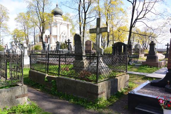 Могила Величко К.И. (1856-1927), военного инженера, 4-й участок, 3-я дорожка1.Объемно-пространственное и архитектурно-художественное решение:исторические местоположение, габариты и конфигурация участка (семейное место); надгробие в виде стелы рваного камня из серого гранита, на прямоугольном в плане ступенчатом основании, внутри семейного захоронения, с поребриком и оградой; ограда – вид материала и техника исполнения (металл, ковка), исторический рисунок (диагональная сетка); характер и содержание надгробной надписи.
