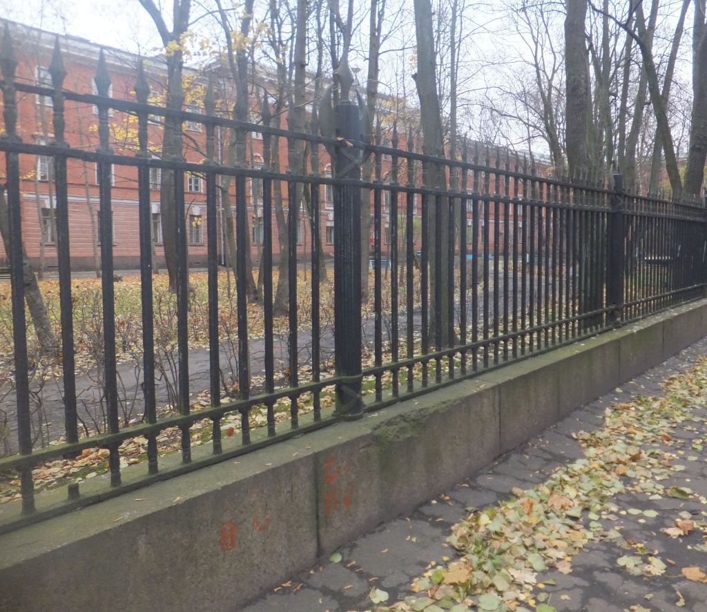 Объемно-пространственное решение:местоположение (перед курдоньером главного здания госпиталя с южной стороны), габариты и конфигурация ограды на цоколе с двумя фланкирующими двустворчатыми воротами и одностворчатой калиткой.Конструктивная система:историческая конструкция ограды, включая: гранитный цоколь;навершие ограды, створки ворот и калитки – габариты, материал (металл), техника исполнения (литье, ковка),Архитектурно-художественное решение: навершие ограды, включая створки калиток и ворот – оформление и рисунок:столбы круглого сечения в виде стилизованых фасциий с ликторскими топориками и пиковидным навершием в завершении;горизонтальные направляющие прямоугольного сечения,вертикальных стоек со стилизованными пиковидными завершениями;фигурные завершения створок ворот.