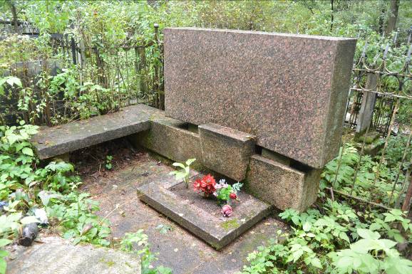 Объемно-пространственное и планировочное решение территории: местоположение могилы в западной части Шуваловского кладбища на Крутой дорожке, конфигурация участка семейного захоронения(№ 6 на схеме); захоронения в границах участка. Объемно-пространственное и архитектурно-художественное решение:габариты, конфигурация и объёмно-пространственное решение надгробия в виде архитектурной композиции из красного гранита, состоящей из горизонтально расположенной с вогнутой лицевой поверхностью прямоугольной стелы, основании параллелипипеде с замковым камнем, примыкающей гранитной скамьёй и цветником ограниченным гранитным поребриком (надгробие расположено на земляной площадке семейного захоронения, на лицевой поверхности стелы высечены конртррельефные шрифтовые литеры надгробных надписей); содержание и характерные особенности надгробных надписей.