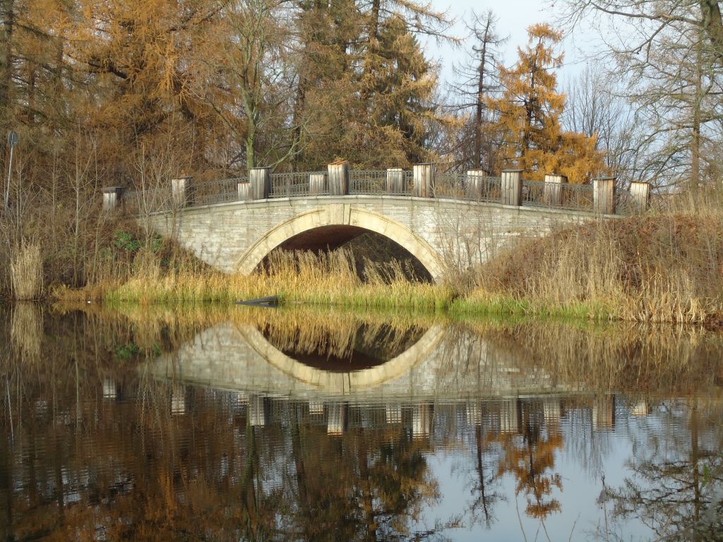1. Объемно-пространственное решение: исторические габариты, конфигурация и местоположение одноарочного моста-плотины (включая береговые устои) на северном берегу Большого (Оранжерейного) пруда, на краю Верхней террасы, на дороге от Гофмейстерского корпуса к дворцу Великого князя Михаила Николаевича;2. Конструктивная система: мост с полуциркульной аркой проема, опирающейся на береговые устои, с большой, ступенчатой в профиль плотиной-каскадом и ограждением, исторический материал моста, плотины-каскада и тумб ограждения (камень), решетки ограды (металл);3. Архитектурно-художественное решение: историческое архитектурно-художественное решение моста-плотины по проекту архитектора А.И. Резанова: облицовка фасадов, арки моста, тумб ограждения блоками натурального камня, оформление центральной пары тумб (над замковым камнем арки) вазами с цветами, металлическая решетка ограды геометрического рисунка, профилированный карниз из натурального камня.