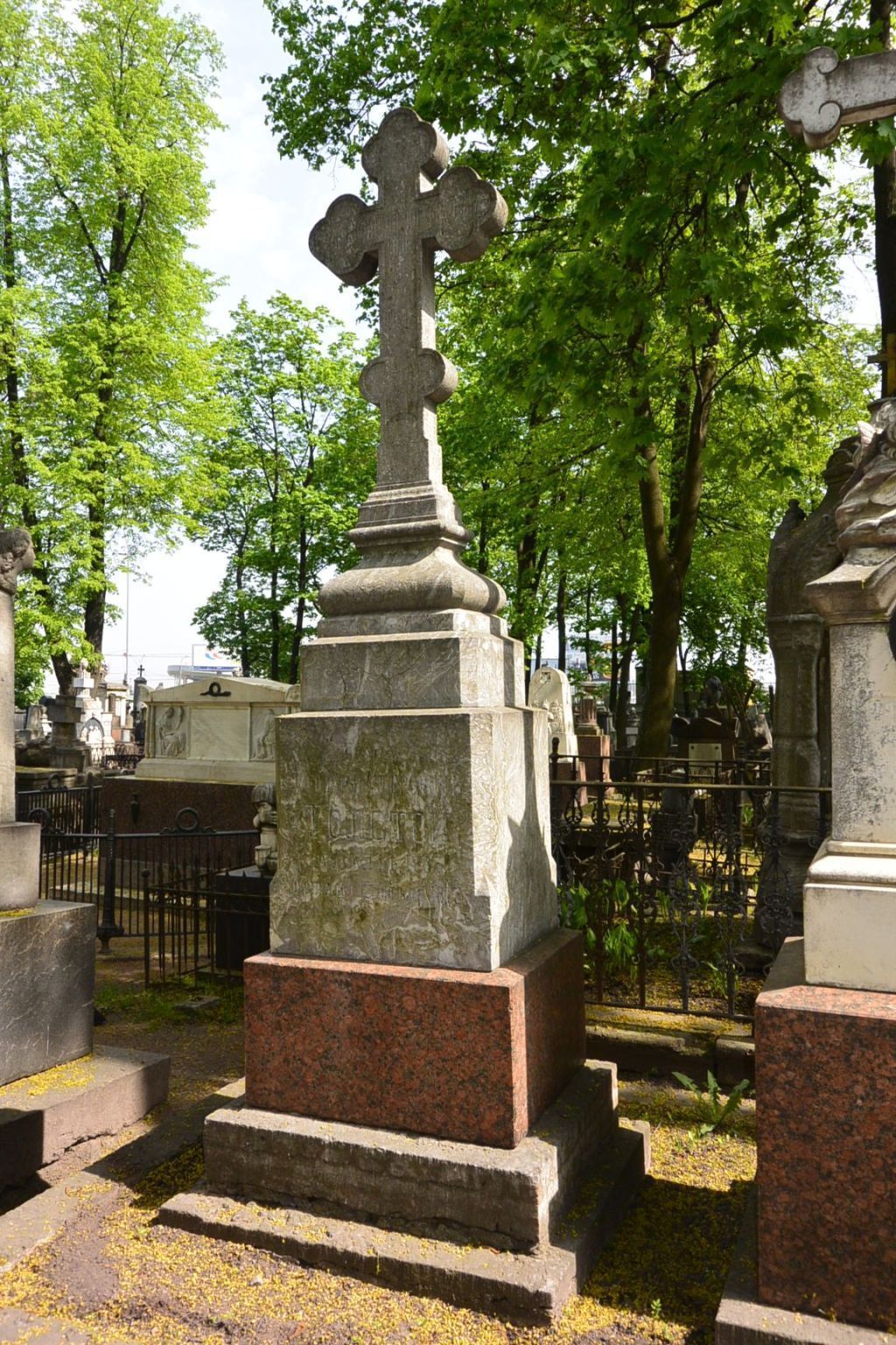 Объемно-пространственное и архитектурно-художественное решение:местоположение захоронения, габариты и конфигурация надгробия; историческое художественное решение надгробия: мраморный крест на гранитном постаменте и ступенчатом основании из известняка; характер и содержание надгробной надписи.
