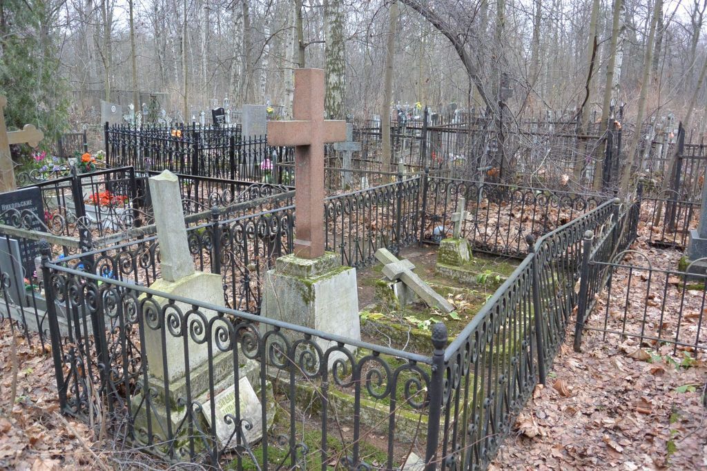 Объемно-пространственное и планировочное решение территории: историческое местоположение и конфигурация семейного участка (№ 28 на схеме); захоронения в границах участка.Объемно-пространственное и архитектурно-художественное решение:исторические местоположение, габариты и конфигурация надгробия (семейное место); объемно-пространственное решение надгробия (четырёхконечный крест из красного гранита на ступенчатом пьедестале с цветником, внутри ограды); ограда – вид материала (металл), рисунок (исторический), техника исполнения (ковка);характер и содержание надгробных надписей.