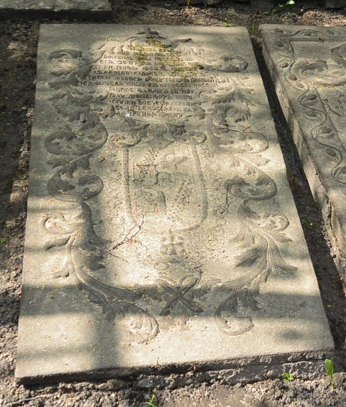 Объемно-пространственное и архитектурно-художественное решение: местоположение захоронения, габариты и конфигурация надгробия; историческое художественное решение надгробия: плита литого металла с рельефным декором и надписью; характер и содержание надгробной надписи.