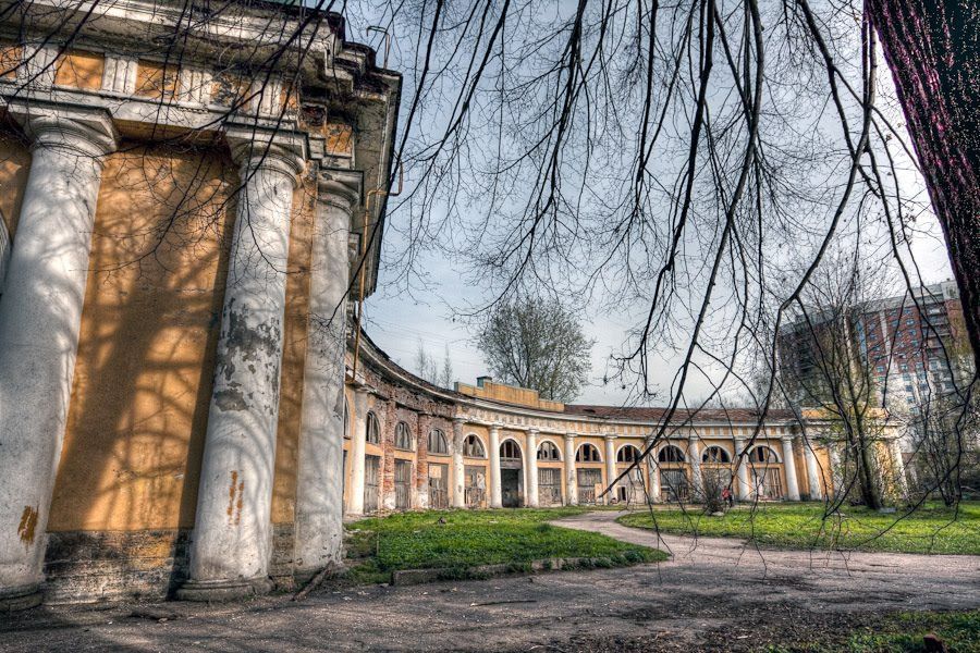 1). Объемно-пространственное решение:габариты и конфигурация двухэтажного дугообразного в плане здания, с прямоугольными павильонами на концах, с воротным проездом в центре, перекрытым цилиндрическим сводом;крыша – габариты и конфигурация (двускатная, включая слуховые окна);материал окрытия – гладкая сталь.2). Конструктивная система здания: наружные и внутренние исторические капитальные стены – местоположение, материал (кирпич);типы свода – цилиндрический (в воротном проезде).3). Объемно-планировочное решение: в габаритах наружных и исторических внутренних стен.4). Архитектурно-художественное решение (композиция) фасадов: материал и характер отделки цоколя – известняк;материал и характер фасада – гладкая фактура штукатурки;дверные, воротные и оконные проемы – местоположение, габариты, конфигурация (прямоугольная, полуциркульная, арочная);цветовое решение фасадов – с выделением деталей белым цветом.Западный (главный) фасад:решение в виде вогнутой пятнадцатиосевой аркады с двадцатью двумя полуколоннами тосканского ордера;полуколонны – местоположение, материал (кирпич), перемежающийся с плитами известняка, известняковые базы), фактура лицевой поверхности фустов – гладкая штукатурка;оформление оконных проемов 2-го этажа – профилированные архивольты; оформление центрального воротного проезда – профилированный архивольт и наличник;гладкий архитрав (с гутами), триглифный фриз;выносной профилированный венчающий карниз;заполнение верхней части воротного проема – габариты, рисунок, материал (дерево);ступенчатые аттики по центральной и крайним осям.Южный (торцовый) фасад:проемы – местоположение, габариты, конфигурация (полуциркульная, прямоугольная);оформление оконного проема 2-го этажа – профилированный архивольт;четыре парных кирпичных оштукатуренных полуколонны тосканского ордера – местоположение, материал (кирпич, перемежающийся с плитами известняка), фактура лицевой поверхности фустов (гладкая штукатурка), известняковые базы (в настоящее время «утоплены» в культурном слое);гладкий архитрав (с гутами), триглифный фриз;выносной профилированный венчающий карниз;ступенчатый аттик.Северный (торцовый) фасад:проемы – местоположение, конфигурация (полуциркульный, прямоугольный);оформление оконного проема 2-го этажа – профилированный архивольт;четыре парных кирпичных оштукатуренных полуколонны тосканского ордера – местоположение, материал (кирпич, перемежающийся с плитами известняка), фактура лицевой поверхности фустов (гладкая штукатурка), известняковые базы (в настоящее время «утоплены» в культурном слое);гладкий архитрав (с гутами), триглифный фриз;выносной профилированный венчающий карниз;ступенчатый аттик.Восточный фасад:проемы – местоположение, габариты, конфигурация (прямоугольная, арочная, полуциркульная);раскреповки, отделяющие фланкирующие части от криволинейной части фасада;профилированная междуэтажная тяга;гладкий архитрав (с гутами), триглифный фриз;выносной профилированный венчающий карниз;ступенчатые аттики – по крайним осям торцевых частей здания;заполнение верхней части воротного проема – габариты, рисунок, материал (дерево).5). Интерьеры: Четыре ниши с конхами (помещение 3Н, 6) – местоположение, габариты;четыре арочных проема на пилонах (помещение 3Н, 6) – местоположение, габариты