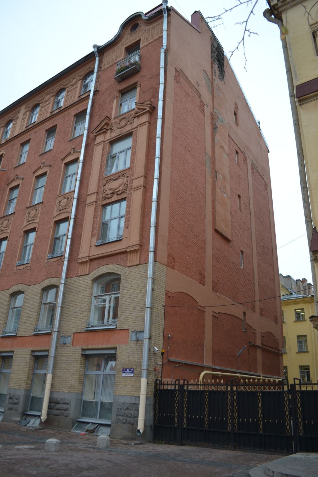 Объемно-пространственное решение:Местоположение (по восточной границе участка, по красной линии Малой Конюшенной ул.. между объектами «Церковь» и «Дом доходный»), габариты;Конструктивная система:Металлическая, трехчастная ограда с глухими створами, с воротами в центральной части.Архитектурно-художественное решение:Оформление—кованые вертикальные пояса с геометрическим орнаментом, горизонтальный фриз с выкружками и завершение в виде наконечников пик.
