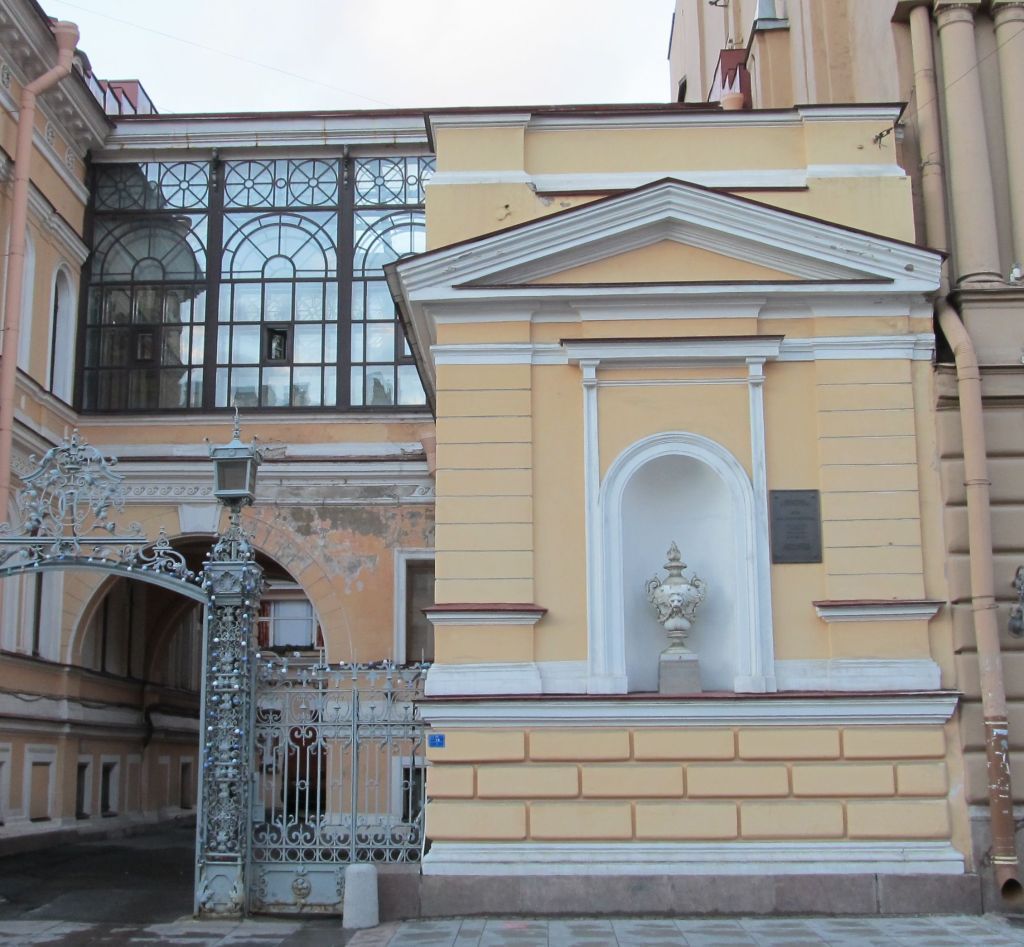 Объемно-пространственное решение:исторические габариты и конфигурация здания;крыши (восточный и поперечный корпуса) – исторические габариты и конфигурация (скатные – восточный корпус, двускатная – поперечный корпус), окрытие кровли (листовой металл – восточный корпус, металлическая конструкция на фермах, с остеклением – поперечный корпус);воротный проезд – количество (один), местоположение (поперечный корпус), конфигурация (с полуциркульным завершением, плоским перекрытием и подпружными арками), габариты.Конструктивная система здания: исторические наружные и внутренние капитальные стены – местоположение, вид материала (кирпич – восточный корпус, 1-й этаж поперечного корпуса, металл, стекло – 2-й этаж поперечного корпуса);междуэтажные перекрытия – местоположение.Объемно-планировочное решение:историческое объемно-планировочное решение в габаритах капитальных стен.Архитектурно-художественное решение фасадов:лицевой фасад:вид материала отделки цоколя – плиты из красного гранита с штукатурным профилем по верхнему краю;вид материала и характер отделки фасада – гладкая и рустованная штукатурка;кирпичный руст в уровне цокольного этажа;уплощенный линейный руст угловых частей фасада в уровне 1-го этажа;ниша – количество (одна), местоположение (в уровне 1-го этажа), конфигурация (с конховым завершением), габариты, оформление (профилированный штукатурный наличник, стилизованные филенчатые пилястры, прямой сандрик на стилизованных кронштейнах);ваза на ступенчатом пьедестале – количество (одна), местоположение (ниша), конфигурация (вытянутое тулово на зауженной ножке), материал вазы (металл), техника исполнения (формовка), материал пьедестала (красный гранит), вид покрытия (краска), оформление (орнаментированная ножка, тулово, декорированное львиным маскароном с растительными гирляндами, рокайльными элементами и листьями аканта; в завершении языки пламени);профилированные межэтажные карнизы, тяга;фриз с профилированной тягой;венчающий профилированный карниз;фронтон – количество (один), местоположение, конфигурация (треугольный), габариты;аттик – количество (один), местоположение, конфигурация (раскрепованный), габариты, оформление (профилированные карнизы);фасады поперечного корпуса:вид материала и характер отделки фасада – гладкая штукатурка;вид материала и характер отделки цоколя – скобы из известняка с штукатурным профилем по верхнему краю;оформление воротного проезда – рустованное обрамление, крепованный замковый камень, профилированные тяги по подпружным аркам;оформление перекрытия воротного проезда – профилированная тяга по периметру перекрытия, профилированные прямоугольные рамы;оконный проем цокольного этажа – местоположение, конфигурация (прямоугольный), габариты;оконный проем 1-го этажа – местоположение, конфигурация (прямоугольный), габариты;оконные проемы 2-го этажа – местоположение, конфигурация, габариты;оформление оконных проемов цокольного, 1-го этажа – профилированные штукатурные наличники;оконное заполнение – рисунок, вид материала (металл);кронштейны – количество (восемь), местоположение (над оконными проемами 2-го этажа), конфигурация, вид материала (черный металл), техника исполнения (ковка), оформление (акантовые листья);профилированные межэтажные карнизы, тяга;венчающий профи