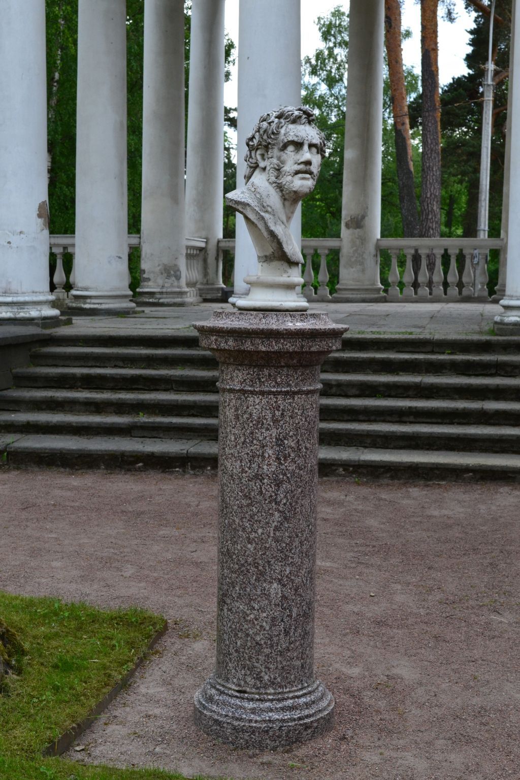Объемно-пространственное и пластическое решение:бюст «Неизвестный мужчина» белого мрамора на круглом в сечении основании из белого мрамора;пьедестал гранитный в виде колонны с профилированной базой, профилированной капителью.