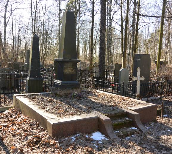Объемно-пространственное и планировочное решение территории: историческое местоположение и конфигурация семейного участка (№ 36 на схеме); захоронения в границах участка.Объемно-пространственное и архитектурно-художественное решение:объемно-пространственное и архитектурно-художественное решение (прямоугольный в плане обелиск из полированного тёмно-серого гранита на ступенчатом профилированном пьедестале внутри подиума с гранитным поребриком и ступенями); характер и содержание надгробной надписи.