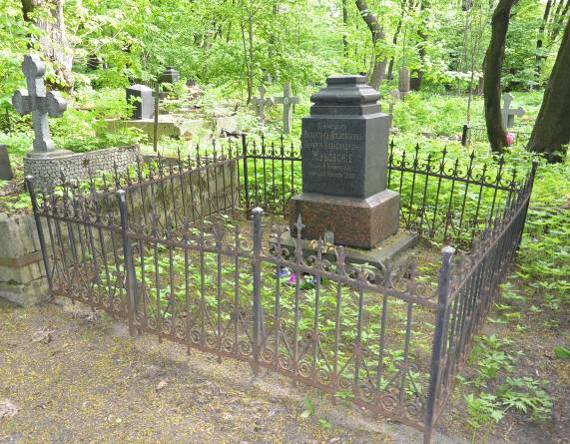 Объемно-пространственное и архитектурно-художественное решение:историческое местоположение захоронения, габариты и конфигурация надгробия (семейное захоронение); историческое решение надгробия в виде квадратного в плане профилированного пьедестала из тёмного гранита на прямоугольном в плане основании из красного гранита (навершие в виде креста (?) утрачено), надгробие установлено на квадратной в плане земляной площадке семейного захоронения ограниченной поребриком с кованой оградой (вертикальные прутья с пиками-лилиями, декорироваными классическими волютами); характер и содержание надгробных надписей.