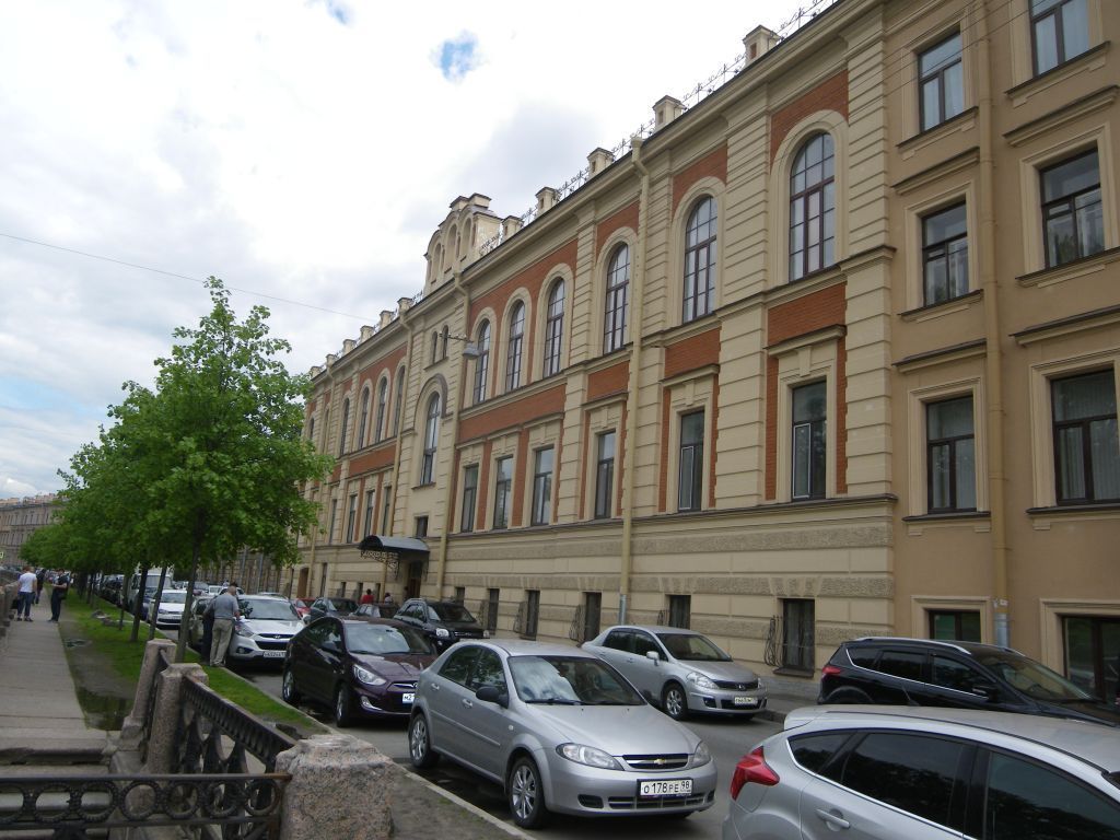 Объемно-пространственное решение: историческое местоположение, габариты и конфигурация прямоугольного в плане здания, расположенного в северной части территории ансамбля, по красной линии наб. р. Мойки, к западному и восточному фасадам примыкают флигели главного дома; габариты, высотные отметки и конфигурация крыши (скатная), материал кровли (листовой металл). Конструктивная система: исторические наружные и внутренние кирпичные капитальные стены;исторические отметки междуэтажных перекрытий – местоположение;своды: прусские по металлическим балкам – воротного проезда, вестибюля, верхней площадки парадной лестницы, коридоров 2-3-го этажей;исторические лестницы – местоположение, габариты, конфигурация, архитектурно-художественная отделка, включая парадную лестницу – двухмаршевую, на косоурах, с известняковыми ступенями, с латунными ковродержателями, с площадками, облицованными метлахской плиткой геометрического рисунка с бордюром, с литым металлическим ограждением в виде вертикальных прутьев с перехватами, с профилированным деревянным поручнем, с площадками по сводам;юго-западную лестницу – двухмаршевую, с известняковыми ступенями и площадками (рисунок укладки плит – геометрический), с металлическим ограждением ажурного рисунка, с профилированным деревянным поручнем;лестницу на чердак (из пом. № 13, площадью 177,3 кв.м.) – металлическую, винтовую, сегментную на опорном стержне;лестницу галереи-перехода в главный дом – междустенную, с известняковыми ступенями, с площадками, облицованными метлахской плиткой – рисунок (соты), цвет (бежевый, серый, коричневый). Объемно-планировочное решение: объемно-планировочное решение в габаритах капитальных стен.Архитектурно-художественное решение фасадов: лицевой фасад:трехэтажный, симметричный, на 13 световых осей, в приемах эклектики;вид материала и характер отделки цоколя – известняк;вид материала и характер отделки фасада – сочетание неоштукатуренных кирпичных плоскостей стен с оштукатуренными деталями; воротный проезд – местоположение (по 2-й световой оси), габариты, конфигурация (с лучковым завершением);исторический дверной проем – местоположение (по 7-й световой оси), габариты, конфигурация (с лучковым завершением);исторические оконные проемы – местоположение, габариты, конфигурация (прямоугольные – в уровне 1-2-го этажей; полуциркульные – в уровне 3-го этажа и по центральной оси);исторический рисунок, цвет (коричневый), оконных заполнений;оформление оконных проемов:оконные перемычки – в уровне 1-го этажа;профилированные наличники, линейные сандрики, замковые камни – в уровне 2-го этажа; профилированные полуциркульные наличники – в уровне 3-го этажа;оформление оконных проемов по центральной оси:подоконные доски;профилированный архивольт на импостах в виде профилированного подоконного карниза фасада – центральное окно;контрналичники – в уровне 2-го света;рустованные пилястры – в оформлении центральной оси фасада и четырех крайних осей – в уровне 2-3-го этажей;профилированные подоконные карнизы, гладкий фриз;венчающий профилированный карниз;историческая звонница – местоположение (по центральной оси фасада), габариты, конфигурация (трехчастная полуциркульная аркада с тремя полуциркульными проемами), оформление (профилированные архивольты, фигурные ниши, прям