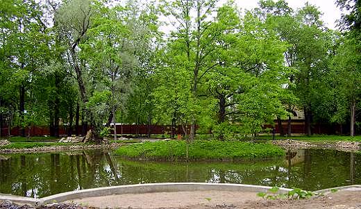 Объемно-пространственное и планировочное решение:конфигурация пруда в плане, включая островок в центре пруда;абрис береговой линии;Конструкции:историческое берего- и дно-укрепление булыжником по урезу воды, дерновые откосы.