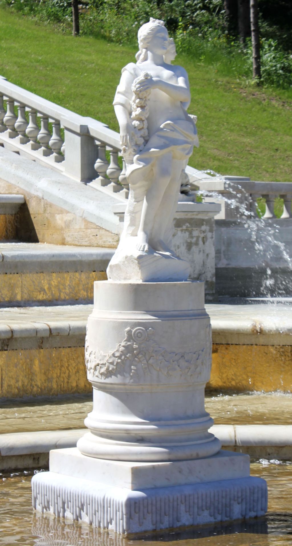 статуя «Весна» на плинте (мрамор, рубка, шлифовка), установлена в центре нижнего бассейна каскада «Золотая гора», женская фигура выполнена в полный рост, полуобнажённая; голова повёрнута вправо и откинута назад, волосы собраны на затылке в узел; торс отклонён назад; двумя руками держит гирлянду цветов, левой рукой и бедром опирается на скалу; упор на правую ногу, левая согнута в колене и выставлена вперёд; через левое плечо перекинута драпировка, спускающаяся по спине и перекинутая через правое бедро на нижнюю часть торса спереди; основание неправильной формы; пьедестал мраморный, цилиндрической формы, на квадратном плинте, оформлен профилированными тягами и фризом из провисающих гирлянд плюща с круглыми розетками и лентами, низ полутрубками.