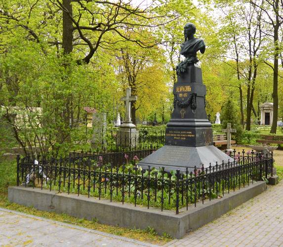 Объемно-пространственное и архитектурно-художественное решение:историческое местоположение захоронения, габариты и конфигурация надгробия; историческое авторское художественное решение надгробия в виде портретного бронзового бюста на высоком фигурном профилированном пьедестале-основании ступенчатом, квадратном в плане пьедестале из чёрного полированного гранита с бронзовыми рельефами символического и растительного характера, внутри подиума ограниченного поребриком из гранитных блоков с металлической кованой оградой (рисунок ограды – вертикальные прутья и стойки с секирообразными завершениями и декором в виде волют); рельефные символы, характер и содержание надгробных бронзированых надписей.