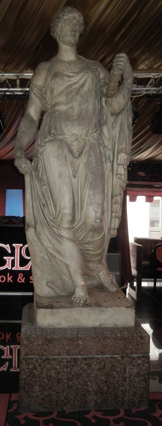 Объемно-пространственноеи архитектурно-художественноерешение: статуя (белый мрамор), изображающаястоящую женскую фигуру в хитоне и вплаще. Опирается на правую ногу, левая– отведена назад. В левой руке венок.Голова в три четверти вправо.Основание квадратное. Пьедесталпрямоугольный в плане (красныйгранит).Время: XVIII в.Размер: выс. – 250 см; основание: 90 х 74см; пьедестал: 78 х 90 х 83 см.