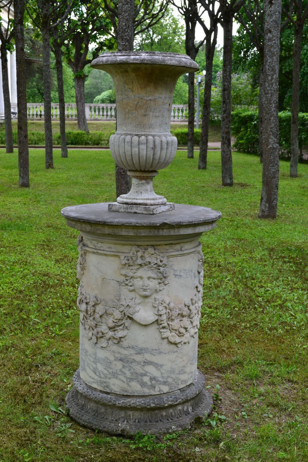 Объемно-пространственное и пластическое решение:мраморная ваза типа кратера с зауженной ножкой с профилировками, ложчатым орнаментом в нижней части тулова вазы; постамент круглый в сечении, мраморный, с барельефом в виде маскаронов и цветочных гирлянд; местоположение;
