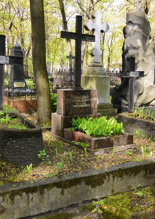 Объемно-пространственное и архитектурно-художественное решение:историческое местоположение захоронения, габариты и конфигурация надгробия (семейное захоронение); типология надгробия четырёхконечный крест на прямоугольном в плане ступенчатом пьедестале-стеле из красного гранита с примыкающим цветником огораниченном поребриком из красного гранита, надгробие установлено на подиуме семейного захоронения; характер и содержание надгробных надписей.